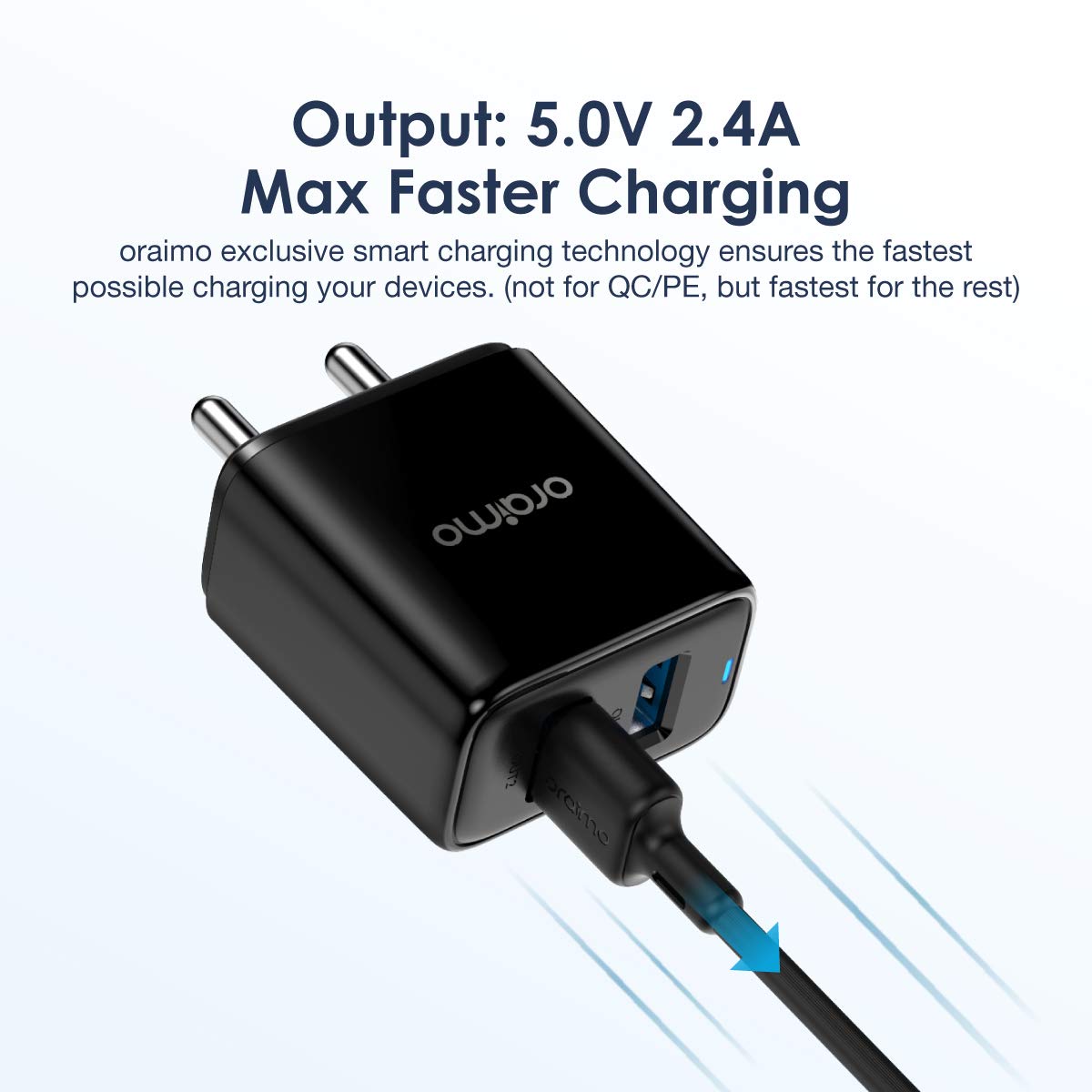 - 【Dual Port USB Wall Charger Adapter】Oraimo USB Charger with dual ports allow you to charge 2 devices at the same time with the total output of 2.4A current. Single port allows Max 2.4A current when connecting only one device. Much more convenient and save your time effectively.